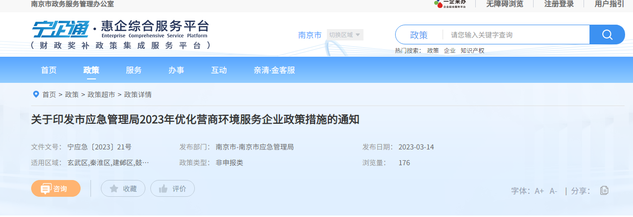 “宁企通”惠企综合服务平台(http://nqt.nanjing.gov.cn)是南京市为进一步优化营商环境,助力企业发展而打造的综合性服务平台。平台集“惠企政策、便企办事、利企服务、政企互动”于一体,汇聚全市各类惠企政策,提供政策兑现申报“一站式”服务。