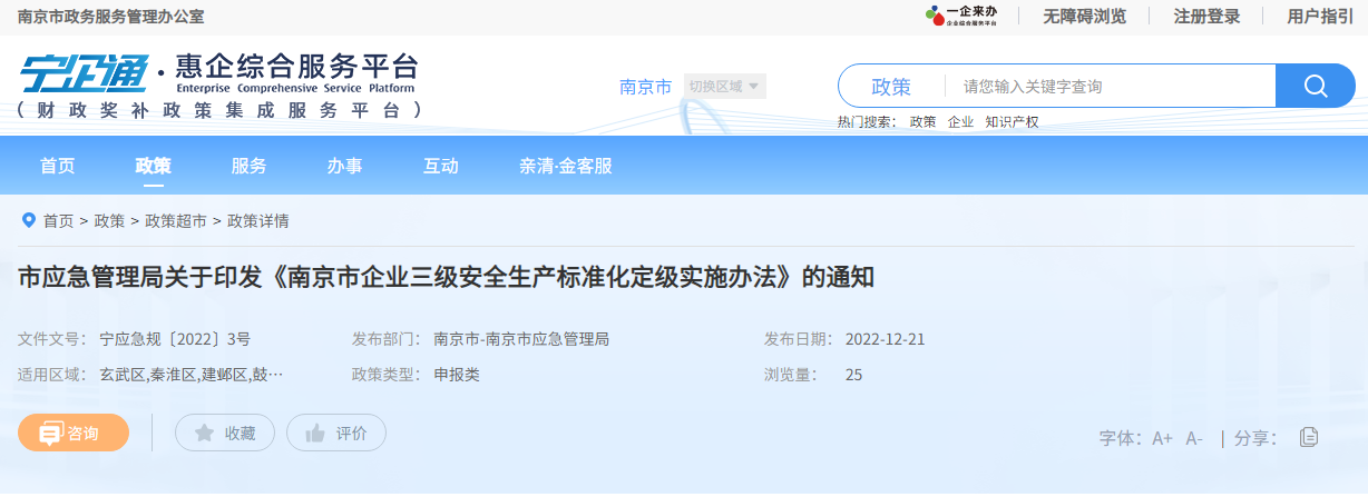 三、市应急管理局关于印发《南京市企业三级安全生产标准化定级实施办法》的通知,其中涉及免申即享事项为:企业三级安全生产标准化定级。