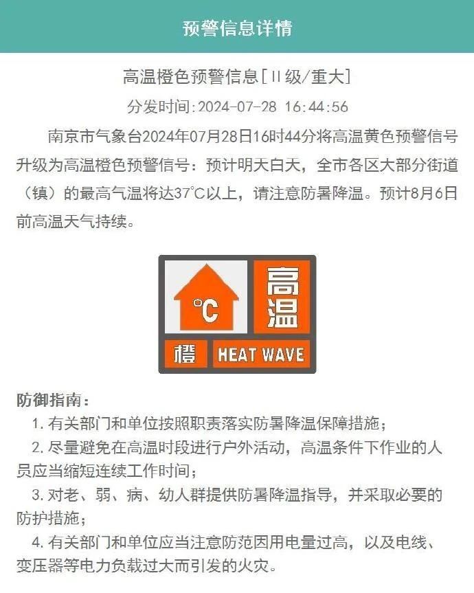 南京市气象台2024年7月28日16时44分将高温黄色预警信号升级为高温橙色预警信号,预计明天白天,全市各区大部分街道(镇)的最高气温将达37℃以上,请注意防暑降温。预计8月6日前高温天气持续。