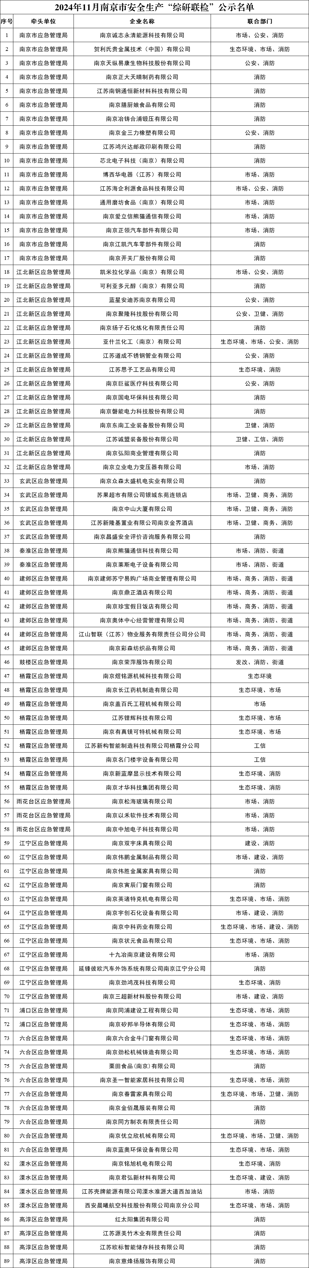为全面贯彻落实国家、省、市优化营商环境政策要求,不断提升安全生产监管执法的精准性和有效性,着力减少多头重复执法,依据《关于印发推行安全生产跨部门综合研判联合检查机制指导意见的通知》(宁安委办〔2023〕20号),现将2024年11月份市、区两级安全生产“综研联检”计划安排(89家)公示如下: