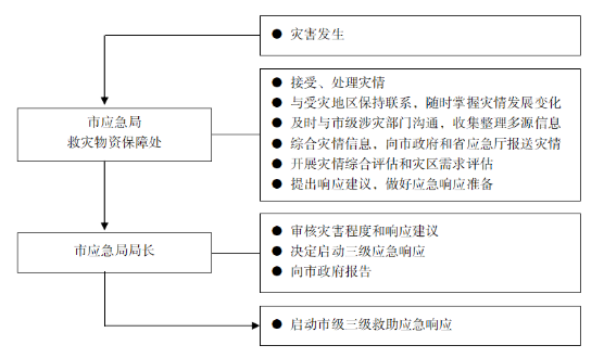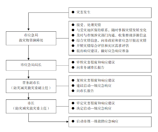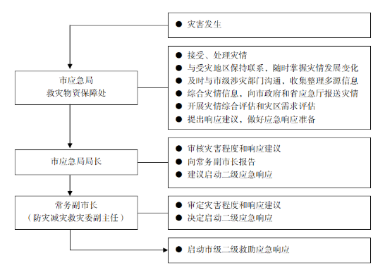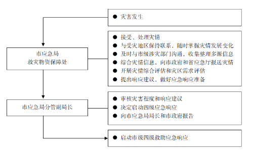灾害发生后,市防灾减灾救灾委日常办事机构(市应急局)经分析评估,认定灾情达到启动条件,市应急局分管副局长决定启动四级应急响应。按照以下流程进行: