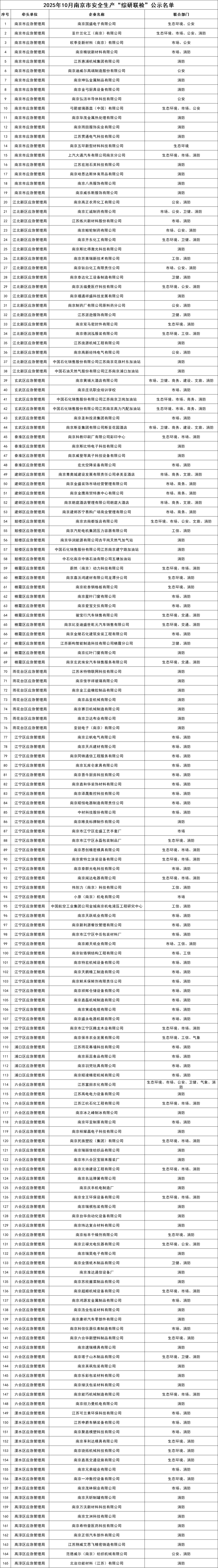 为全面贯彻落实国家、省、市优化营商环境、严格规范涉企行政检查相关要求,不断提升安全生产监管执法的精准性和有效性,着力减少多头重复执法,依据《关于印发推行安全生产跨部门综合研判联合检查机制指导意见的通知》(宁安委办〔2023〕20号),现将2025年10月份市、区两级安全生产“综研联检”计划安排(165家)公示如下: