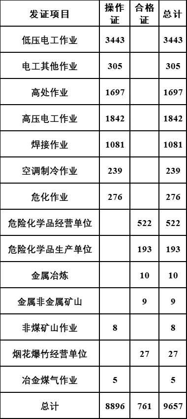 2025年12月全市共组织安全生产“三项岗位人员”理论考试14862人次,实操考试7180人次;共制作、发放各类安全证书9657份。