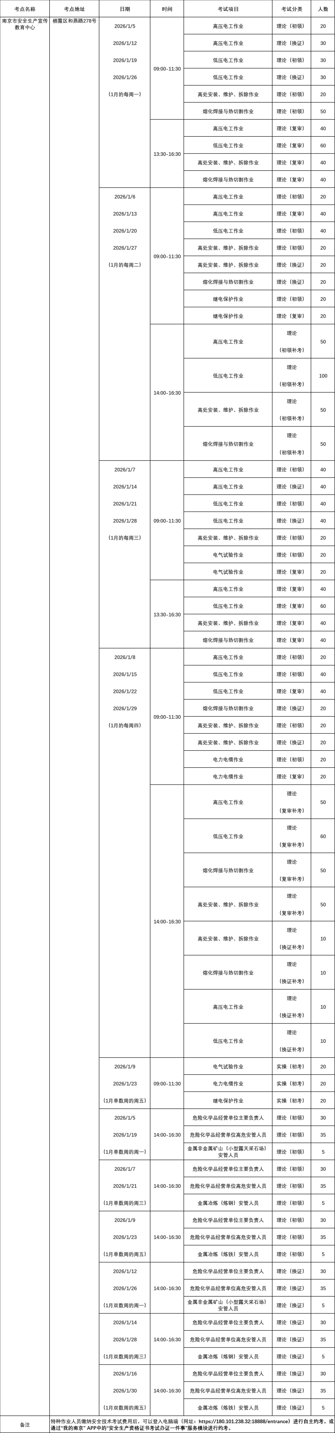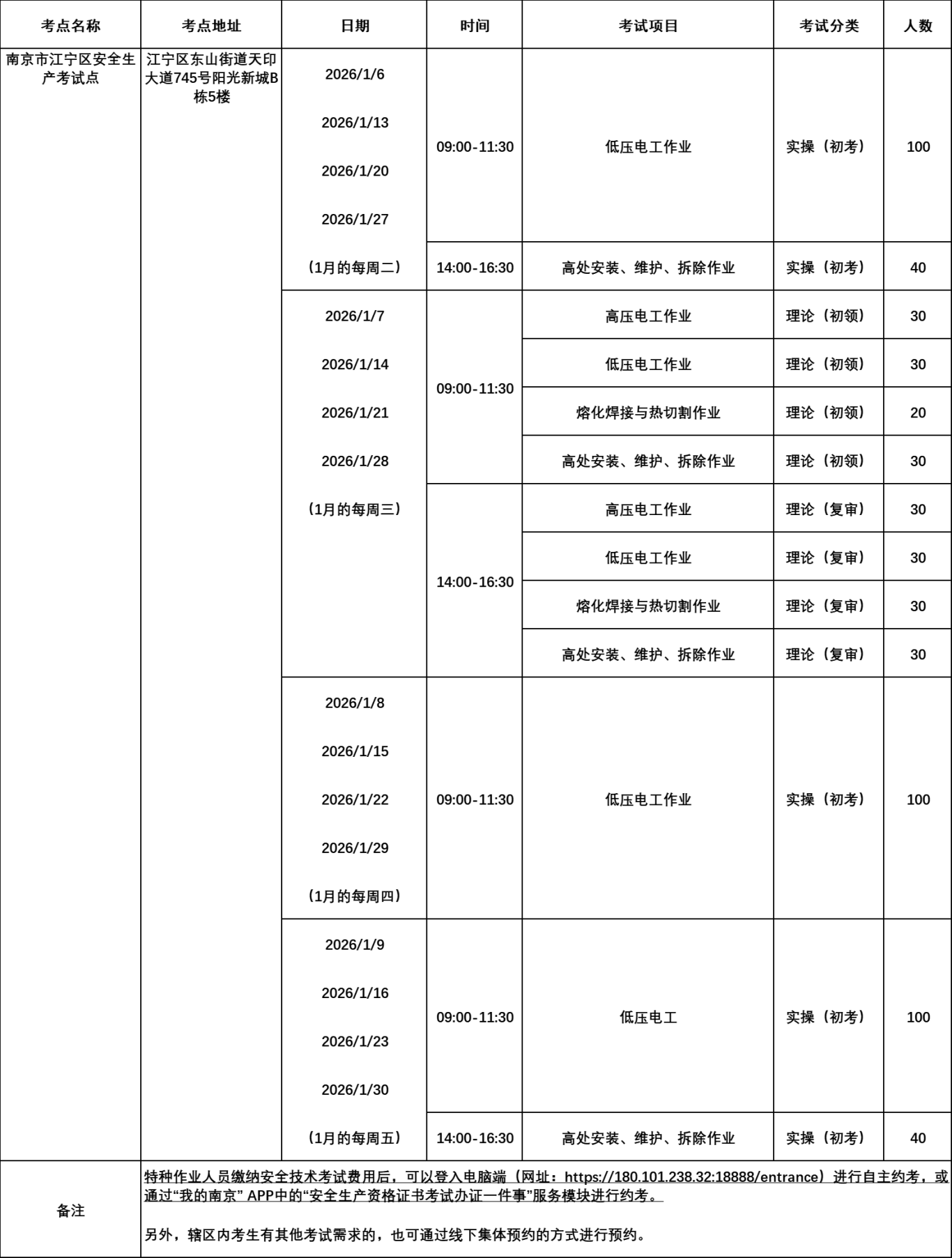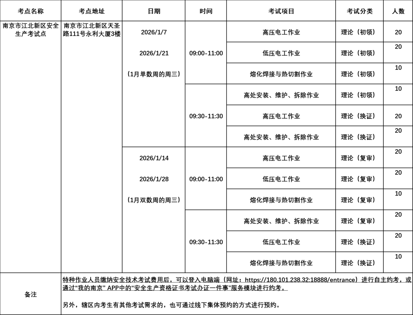为给广大考生提供更便捷、高效的服务,南京市应急管理局结合待考实时数据和全市考点考位分布情况,统筹制定了考试安排。现公布2026年1月南京市安全生产“三项岗位”人员网上预约考位信息,方便考生合理规划考试时间和地点。