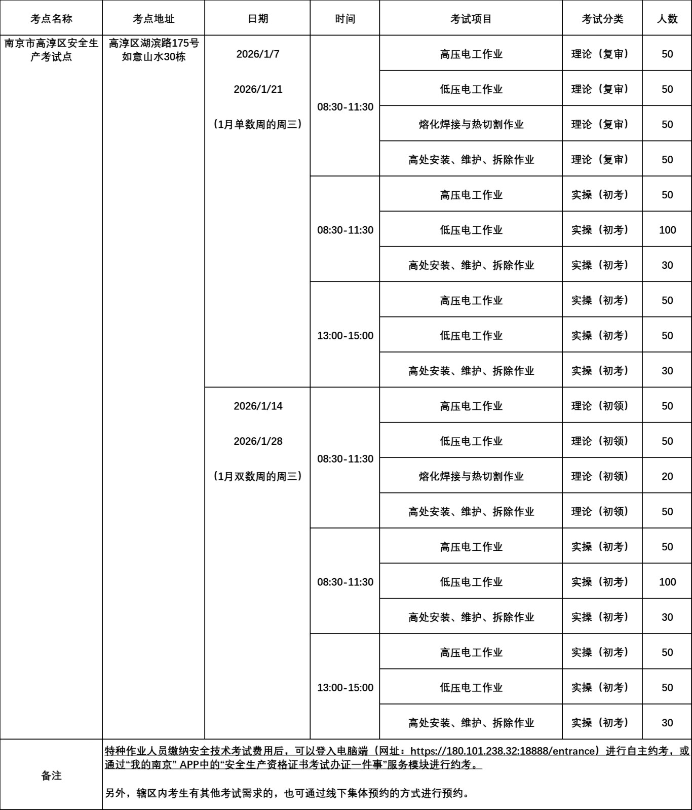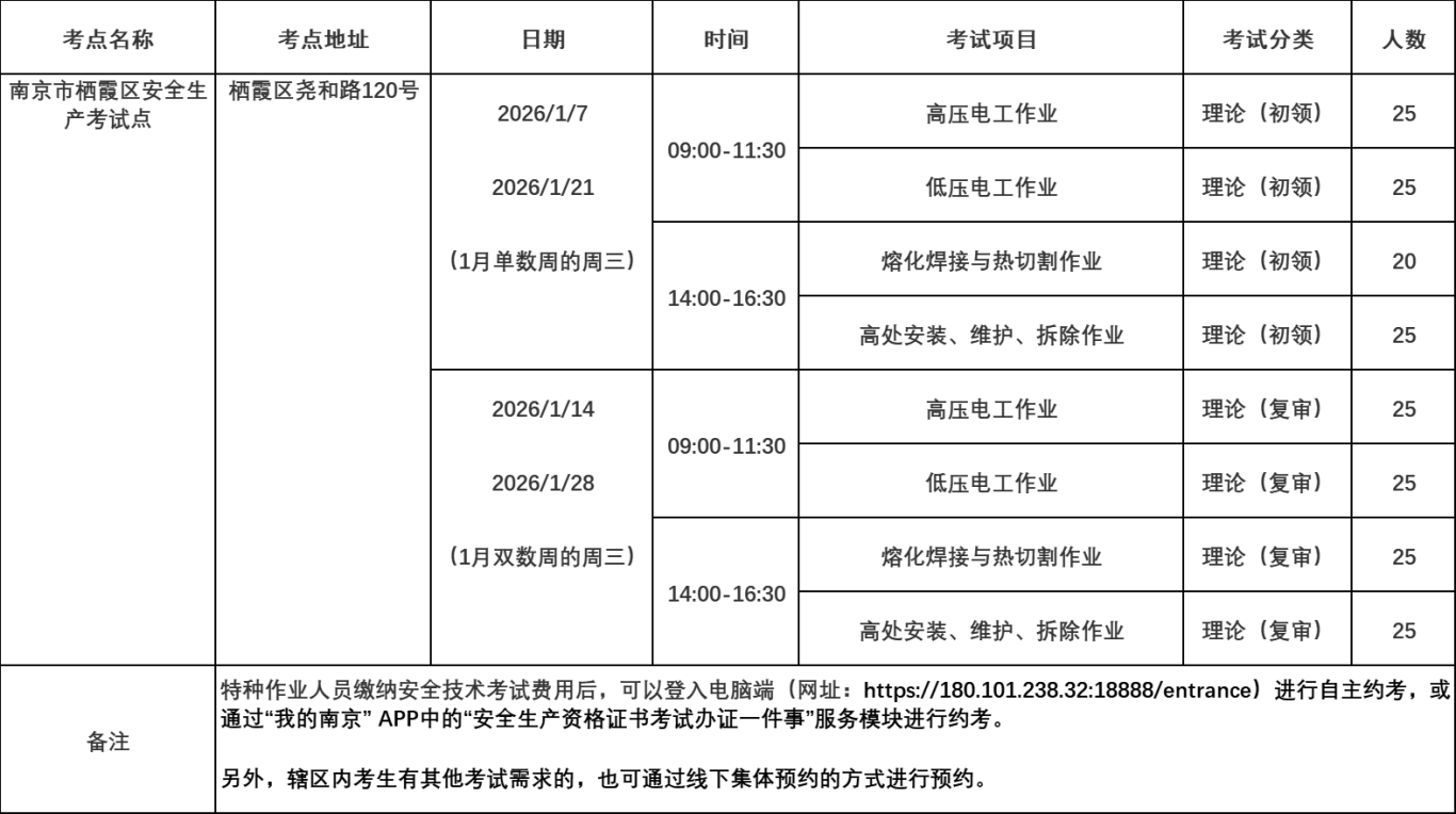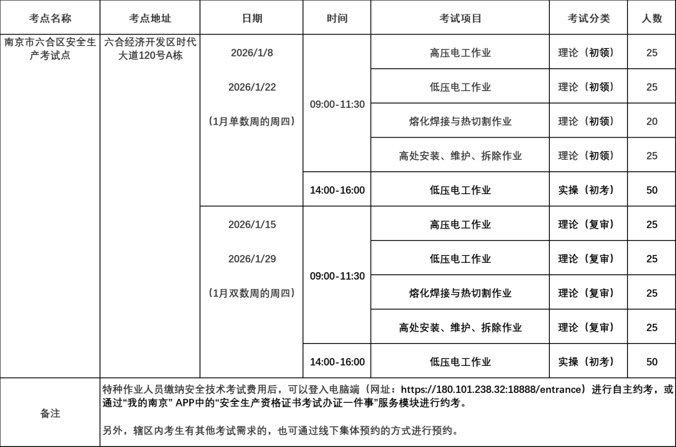 为给广大考生提供更便捷、高效的服务,南京市应急管理局结合待考实时数据和全市考点考位分布情况,统筹制定了考试安排。现公布2026年1月南京市安全生产“三项岗位”人员网上预约考位信息,方便考生合理规划考试时间和地点。