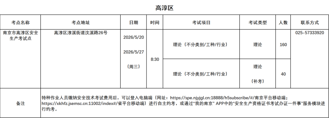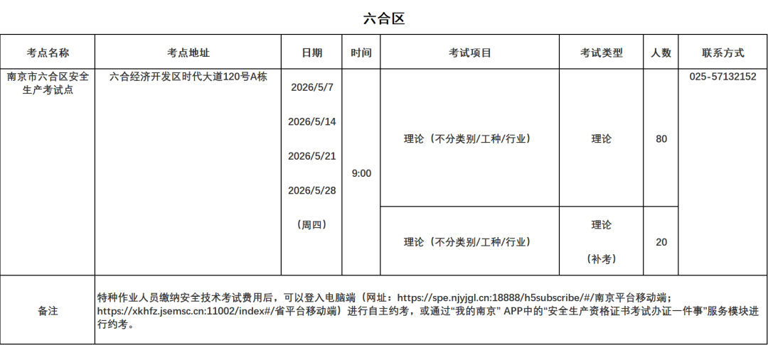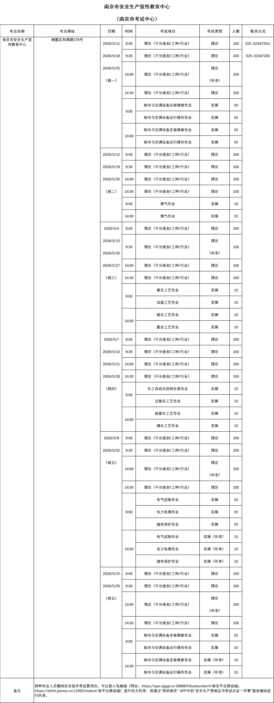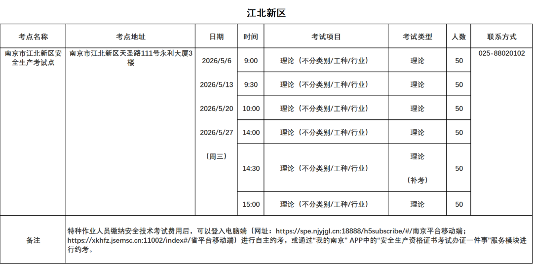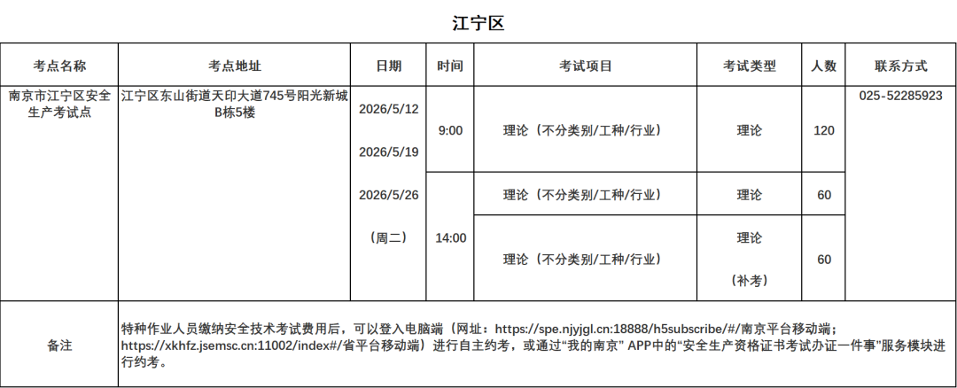 为给广大考生提供更便捷、高效的服务,南京市应急管理局结合待考实时数据和全市考点考位分布情况,统筹制定了考试安排。现公布2026年5月南京市安全生产“三项岗位”人员网上预约考位信息,方便考生合理规划考试时间和地点。